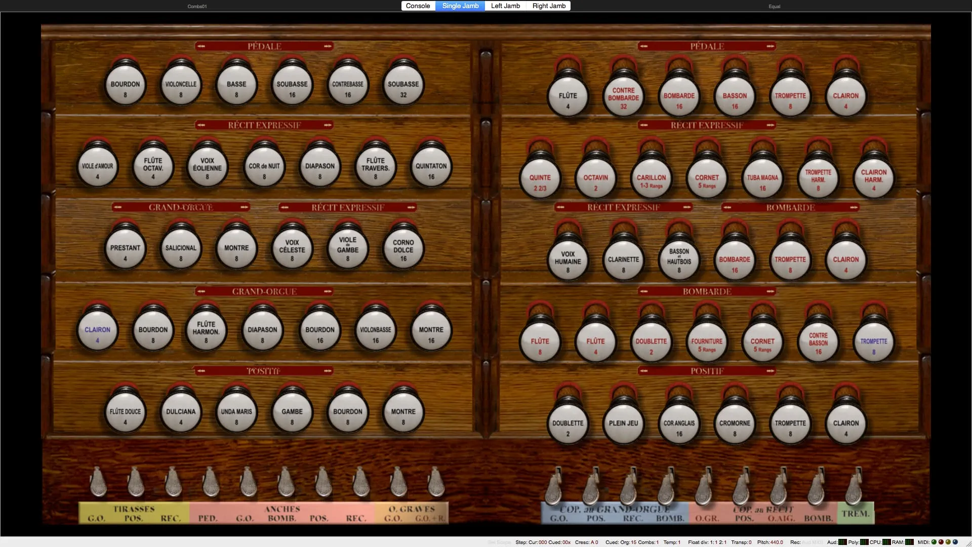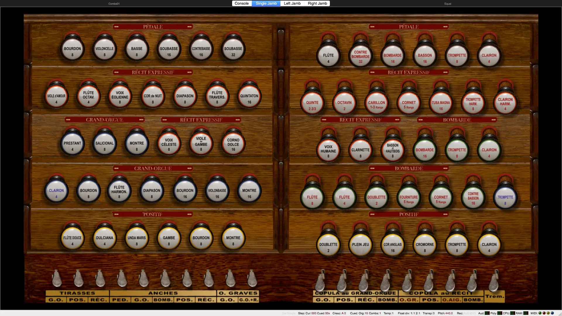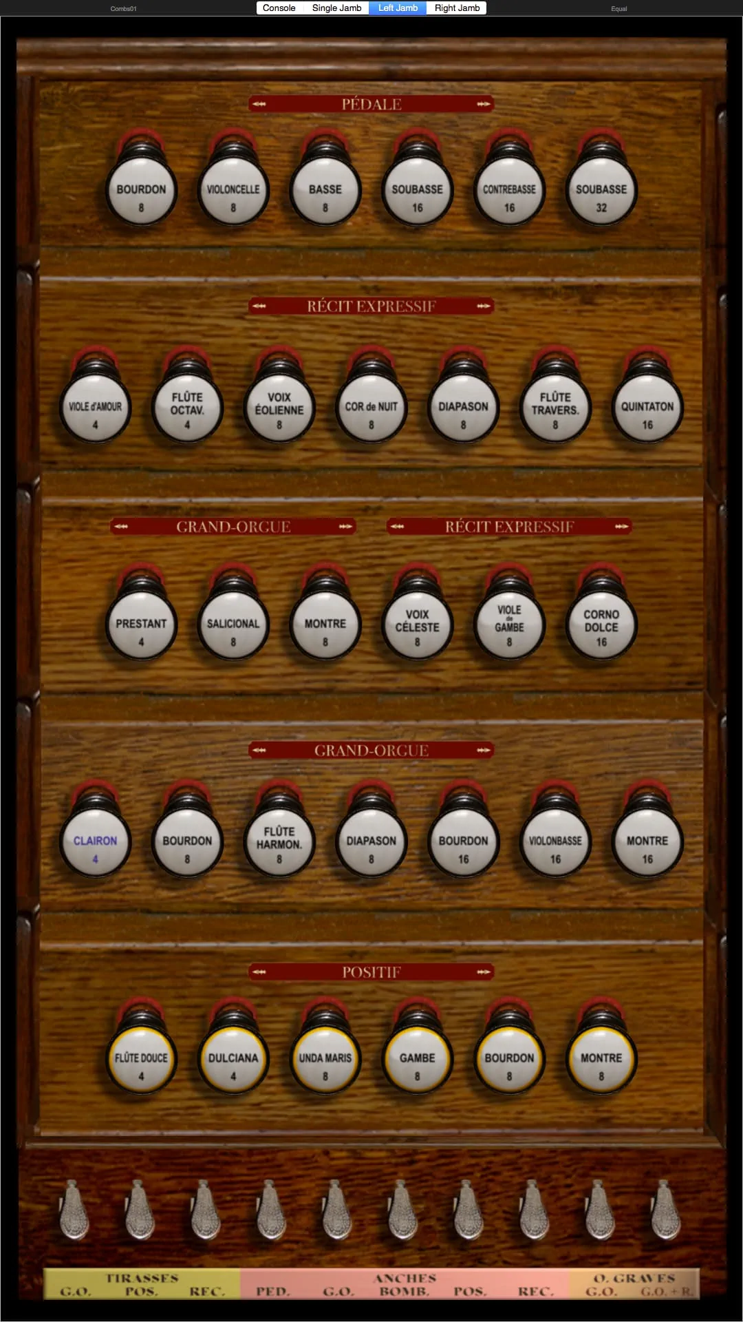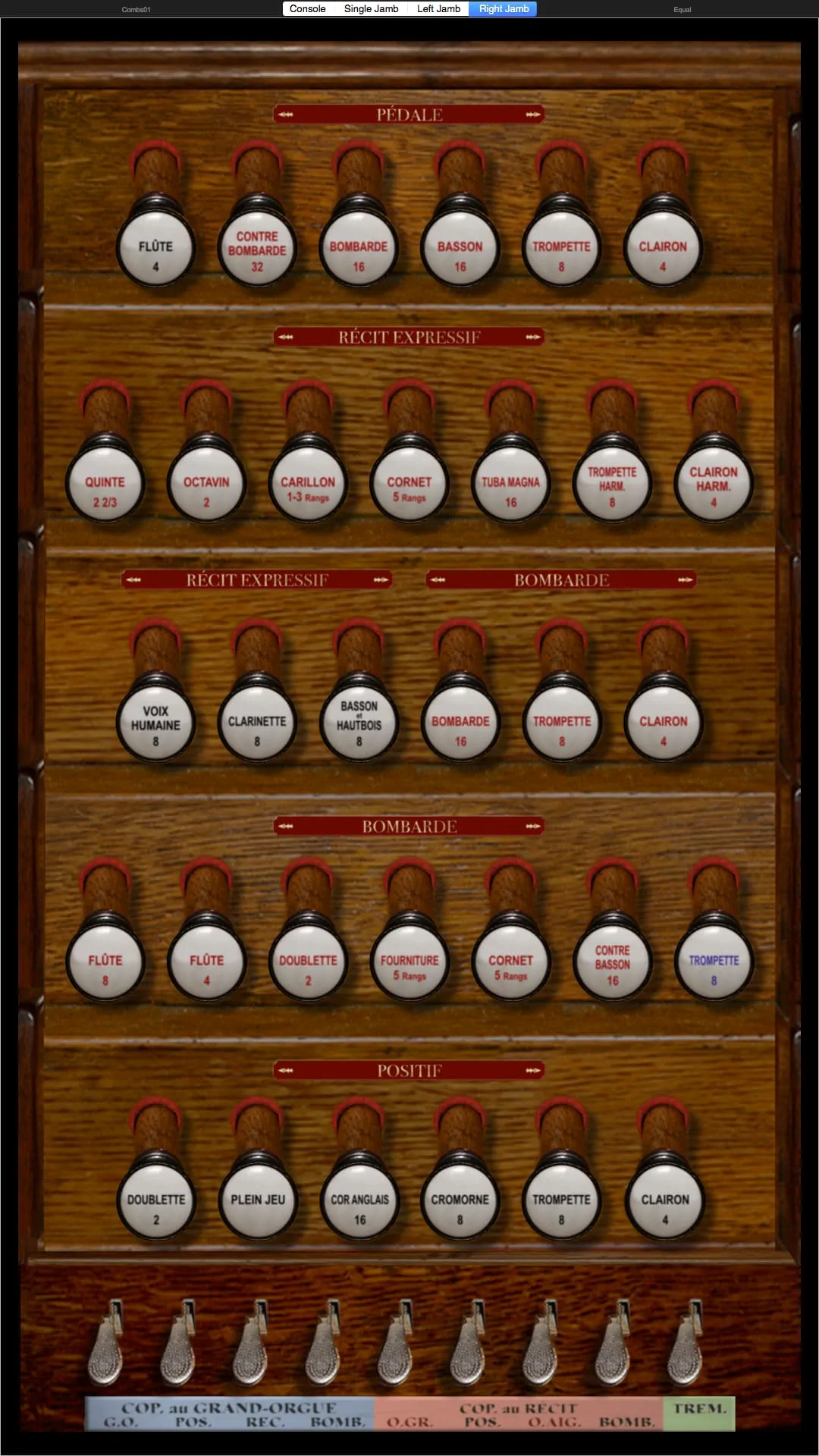 Tirasse G.O., Tirasse Positif, Tirasse Récit, Copula G.O., Copula Positif / G.O., Copula Récit / G.O., Copula Bombarde / G.O., Copula Positif / Récit, Copula Bombarde / Récit, Octaves graves G.O., Octaves graves Récit / G.O., Octaves graves Récit, Octaves aiguës Récit, Anches Pédale, Anches G.O., Anches Positif, Anches Récit, Anches Bombarde, Trémolo Récit, Expression Récit