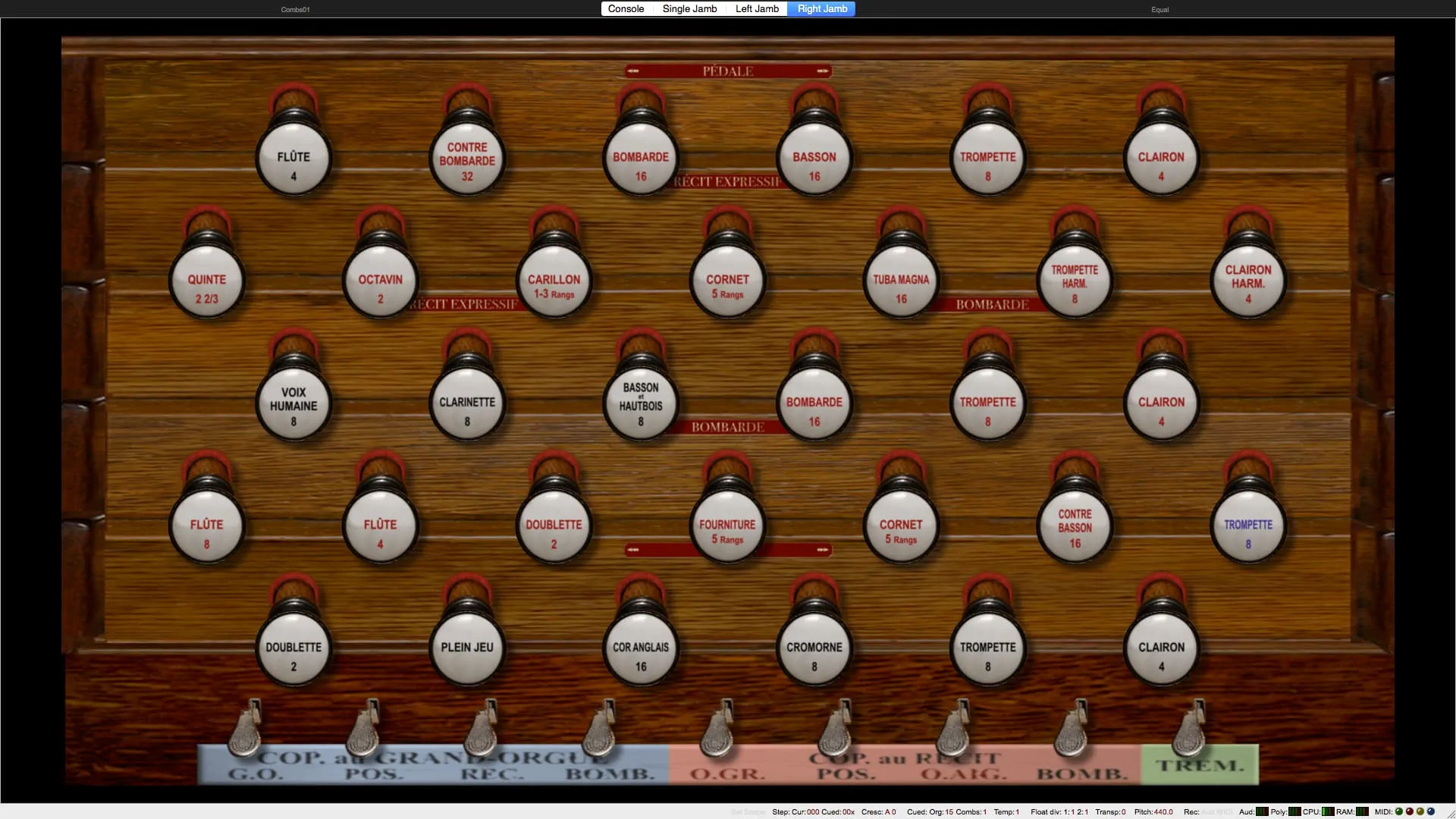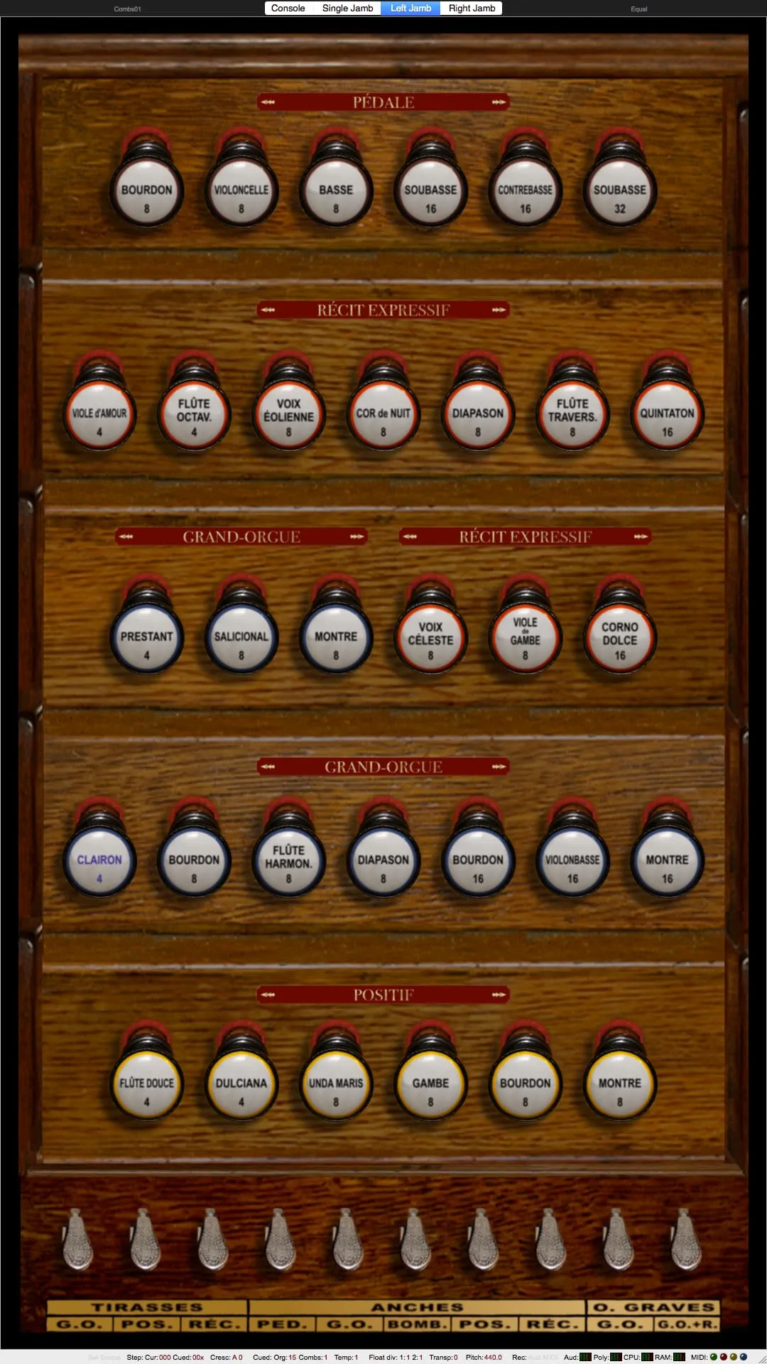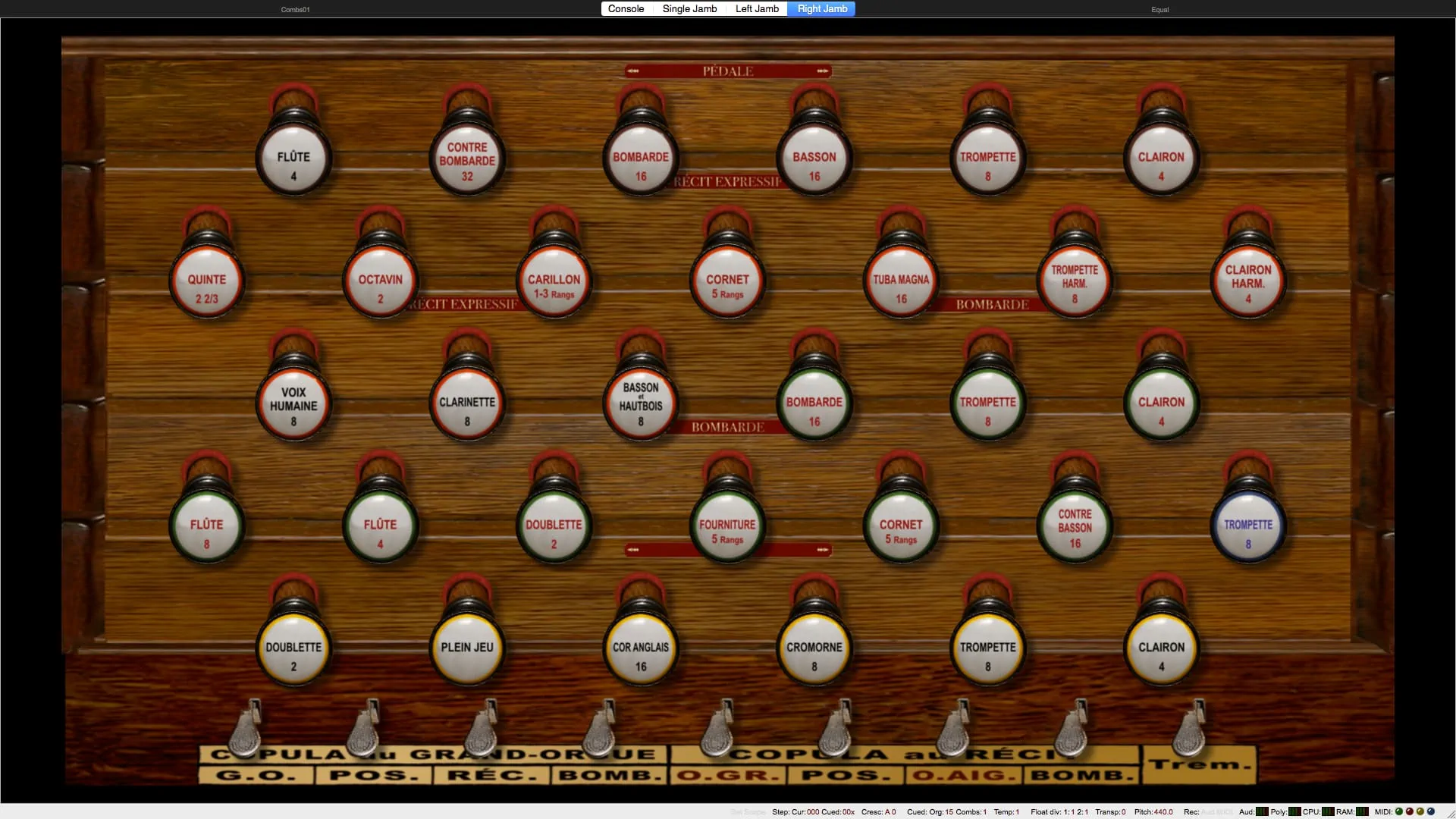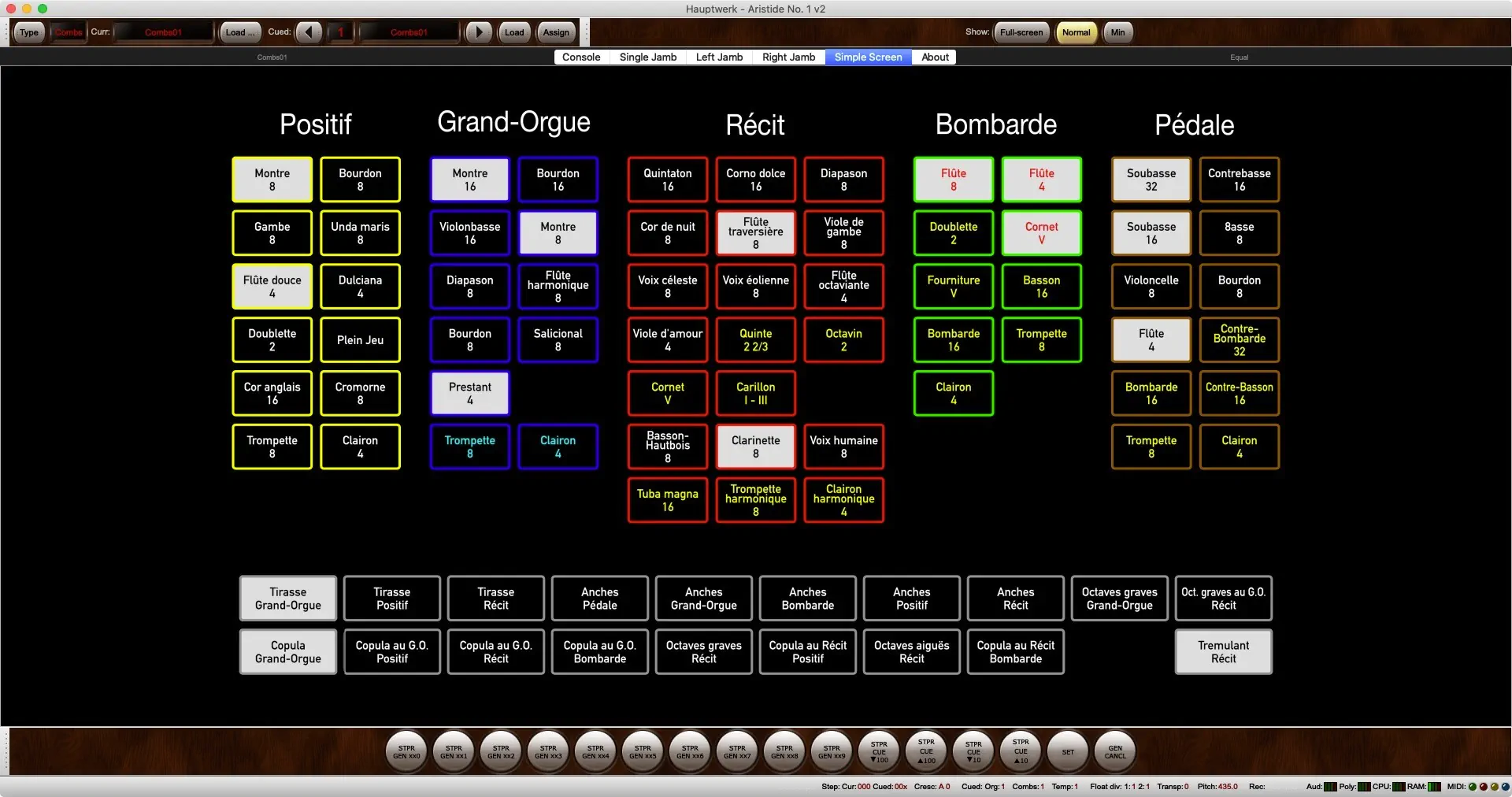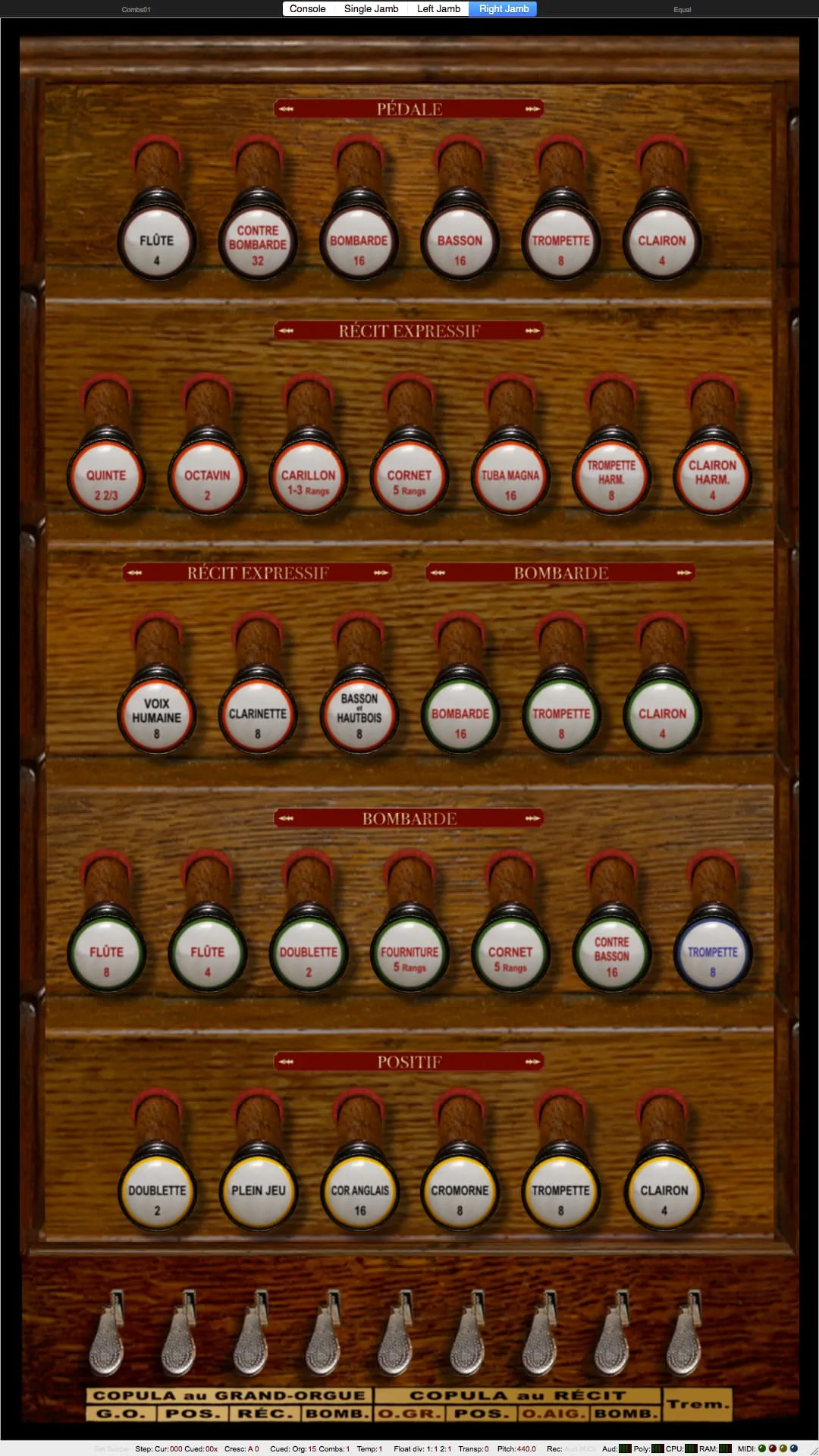 Tirasse G.O., Tirasse Positif, Tirasse Récit, Copula G.O., Copula Positif / G.O., Copula Récit / G.O., Copula Bombarde / G.O., Copula Positif / Récit, Copula Bombarde / Récit, Octaves graves G.O., Octaves graves Récit / G.O., Octaves graves Récit, Octaves aiguës Récit, Anches Pédale, Anches G.O., Anches Positif, Anches Récit, Anches Bombarde, Trémolo Récit, Expression Récit