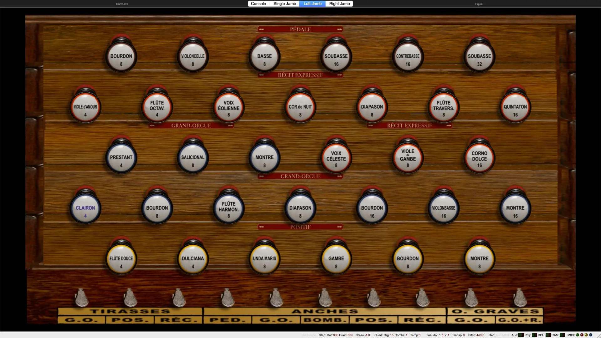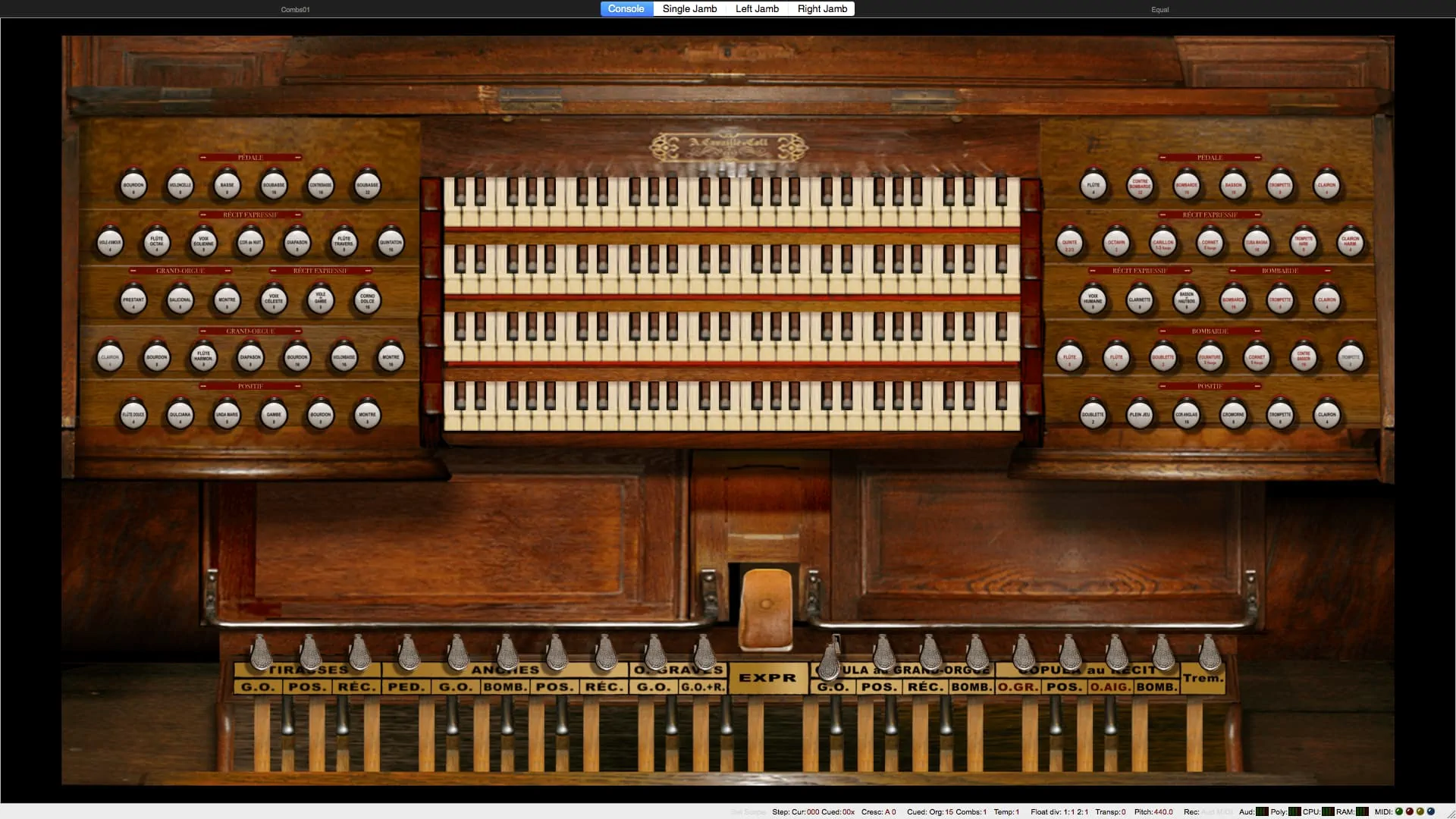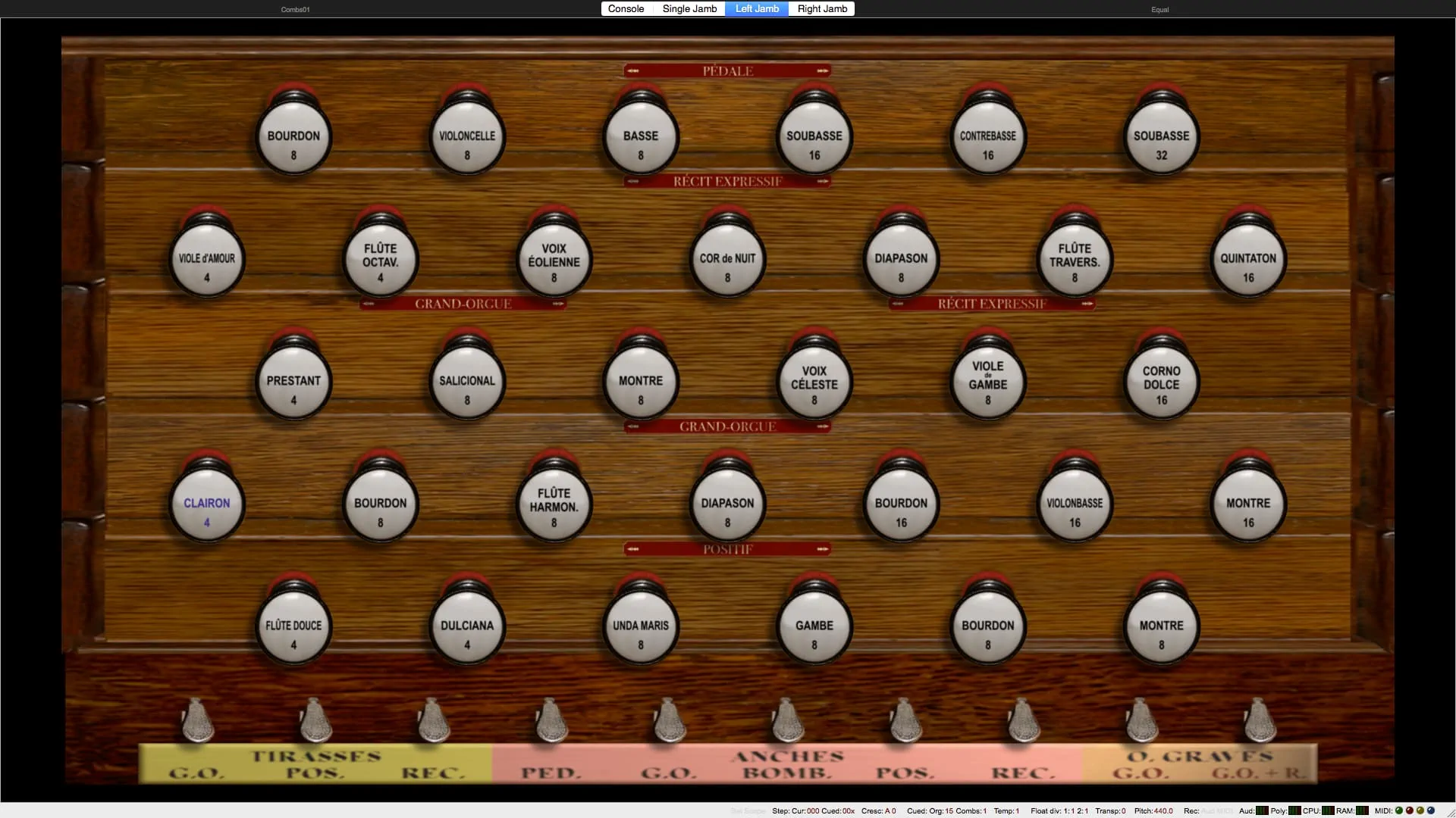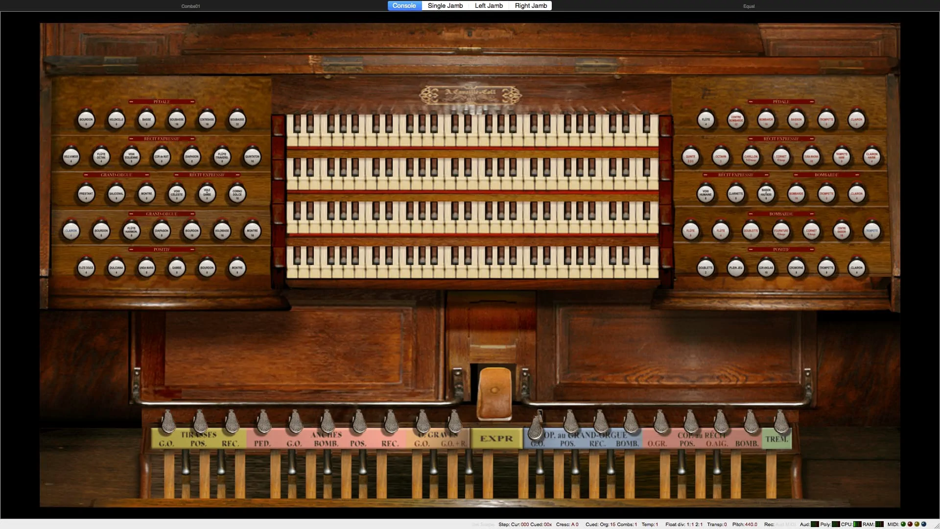 Tirasse G.O., Tirasse Positif, Tirasse Récit, Copula G.O., Copula Positif / G.O., Copula Récit / G.O., Copula Bombarde / G.O., Copula Positif / Récit, Copula Bombarde / Récit, Octaves graves G.O., Octaves graves Récit / G.O., Octaves graves Récit, Octaves aiguës Récit, Anches Pédale, Anches G.O., Anches Positif, Anches Récit, Anches Bombarde, Trémolo Récit, Expression Récit