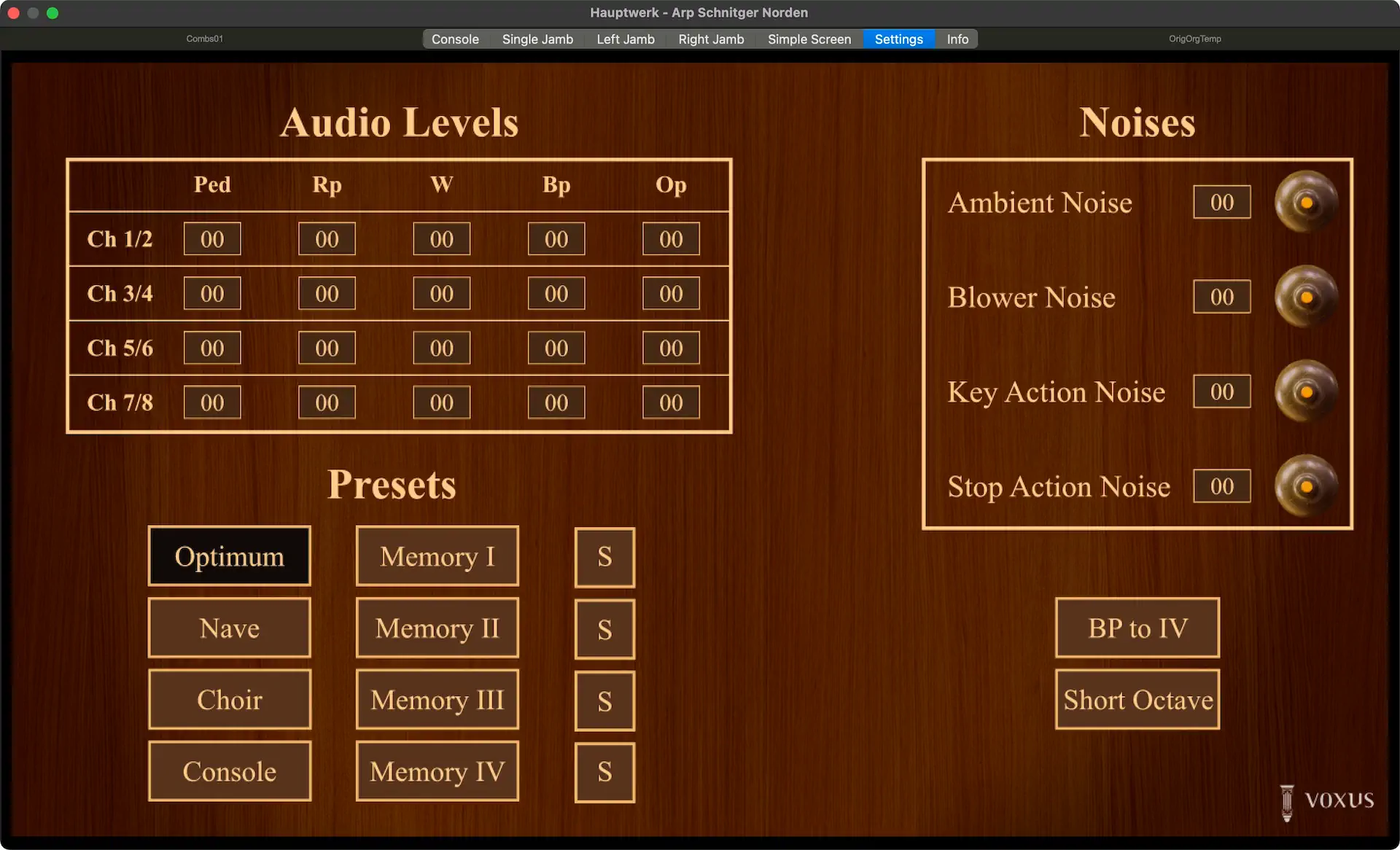 - 4 fixed (Optimum, Nave, Choir, Console) and 4 custom volume presets
