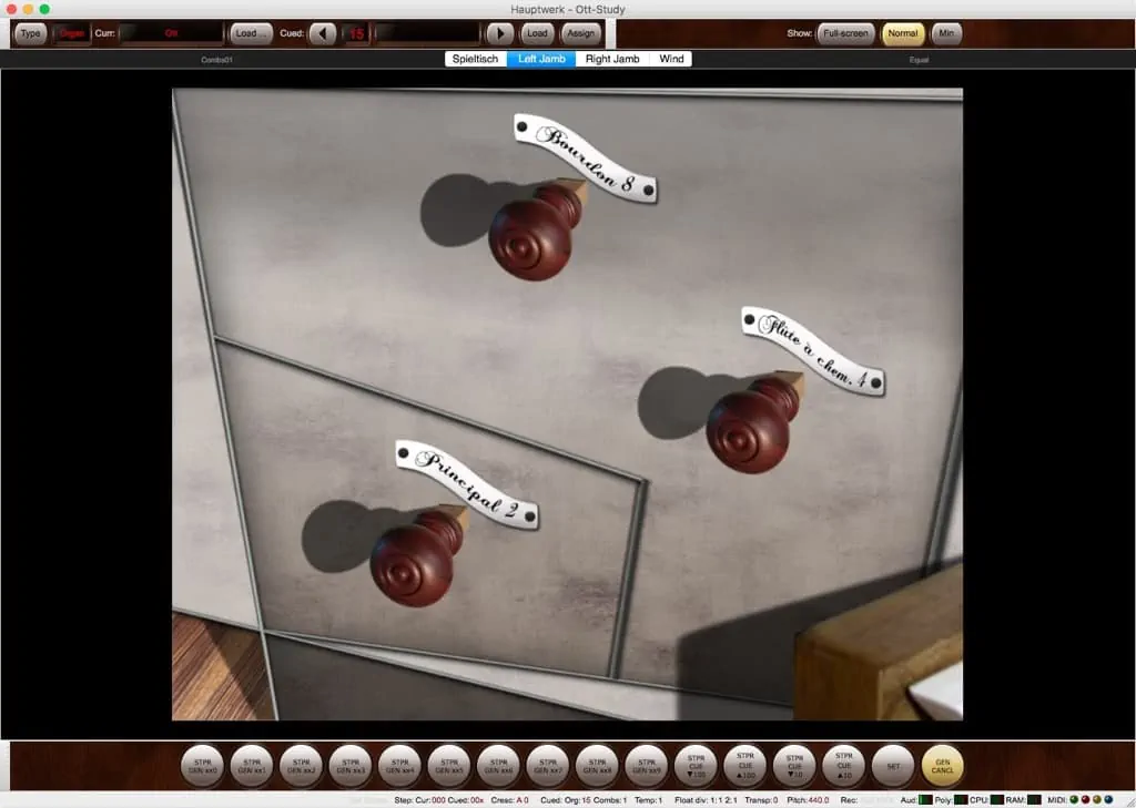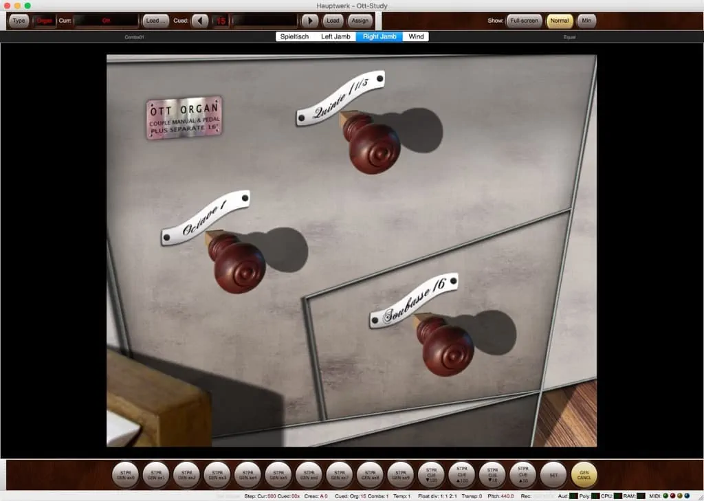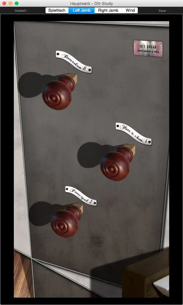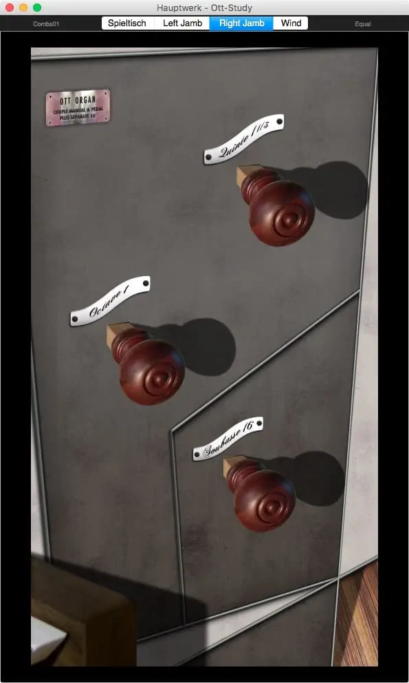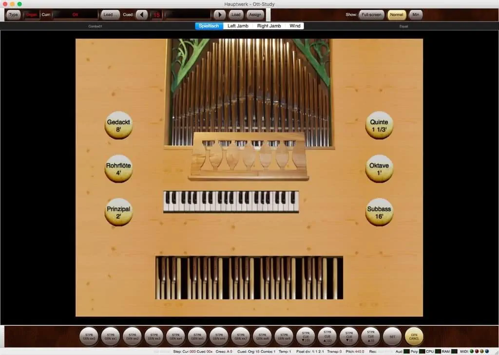 The Ott-Organ is a beautiful tiny rehearsal instrument that was one of the first sample sets available for Hauptwerk™ published in 2004 by Christian Datzko. This tracker organ was built in 2003by Dieter Ott (Göttingen in Northern Germany). It originally has 5 Stops on a single manual (56 keys). The manual is always coupled to the pedal (30 keys). The stops are: Gedackt 8′, Rohrflöte 4′, Prinzipal 2′, Quinte 1 1/3′, and Oktave 1′.